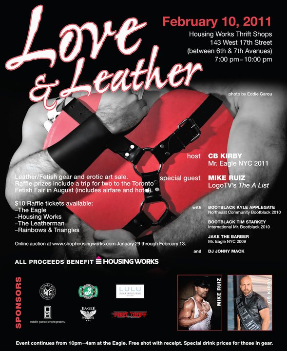 First up on Thursday, Feb 10th, from 7pm-10pm is the charity event LOVE & LEATHER hosted by NYC’s Mr. Eagle 2011, CB Kirby (*swoon*, he’s so dreamy!). This is a leather/fetish gear and erotic art sale (two things one can never have enough of) that benefits House Works, an organization who’s mission is to end the dual crises of homelessness and AIDS. The event is happening at Housing Works Thrift Shops