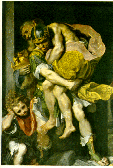 With the fall of Troy, Aeneas flees the burning city carrying his father and holding the hand of his son--3 generations together that would later found the beginnings of Rome.