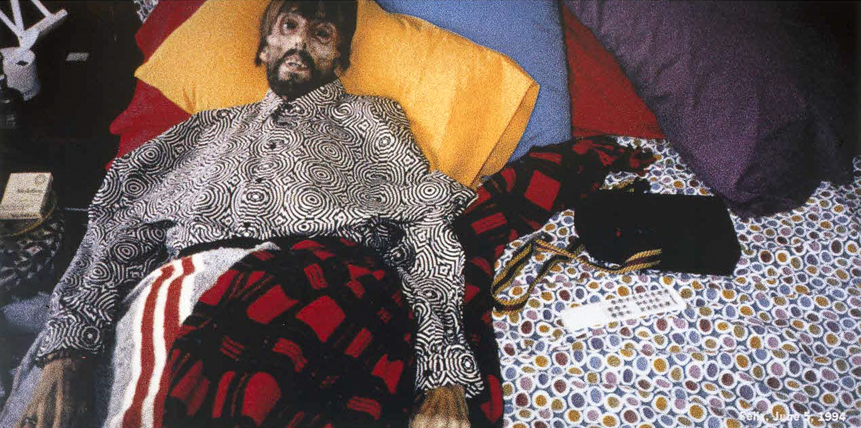 “I made this photograph of Felix a few hours after his death. He is arranged to receive visitors, and his favorite objects are gathered about him: his television remote control, his tape-recorder, and his cigarettes. Felix suffered from extreme wasting, and at the time of his death his eyes could not be closed: there was not enough flesh left on the bone. Felix and Jorge and I lived and worked together from 1969 until 1994. During that time we became one organism, one group mind, one nervous system; one set of habits, mannerisms, and preferences. We presented ourselves as a “group” called General Idea, and we pictured ourselves in doctored photographs as the ultimate artwork of our own design: we transformed our borrowed bodies into props, significations manipulated to create an image, a reality. ”