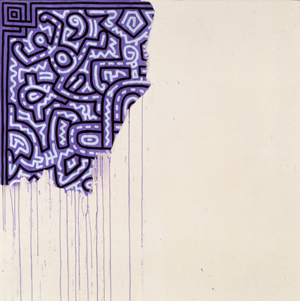 In the midst of the AIDS crisis, the poet Thom Gunn said he never thought there was a “‘gay community’ until the thing was vanishing.” In 1990, 18,447 Americans died of AIDS. The artist Keith Haring would be one of them, passing away on February 16, 1990, at the age of thirty-one. Haring had vaulted to public prominence as a graffiti artist whose comical and mysterious cartoons started appearing randomly in New York City’s subway system and led him to mainstream fame in the art world. The sketchy, skittering nature of his drawing is worked into this painting, but the structure of the unfinished work gives it a formal weight. The hanging strings of the unfinished painting suggest not just incompletion but unraveling.